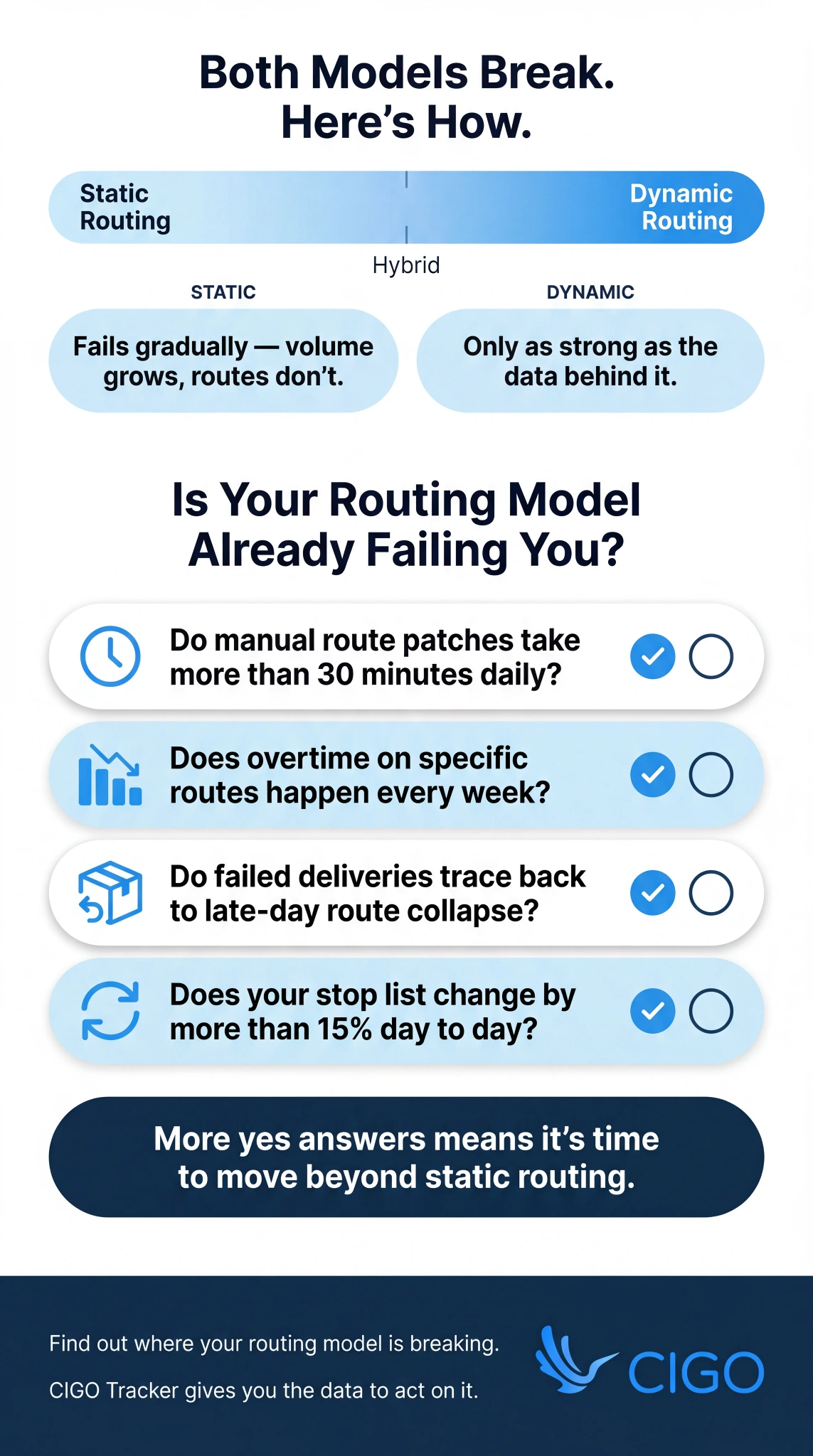 CIGO Tracker gives you the execution data to identify which failure mode is active in your fleet. Start a free trial or contact us today to see where your routing model is breaking down.